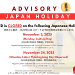 Holiday Advisory: Sept 15 (Respect for the Aged Day) & Sept 23 (Autumnal Equinox Day)September 12, 2025Holiday Advisory: Nov 3 (Culture Day) & Nov 24 (Labor Thanksgiving Day Observed)October 27, 2025 Published by Mae Resma Incleto at October 5, 2025 Categories Uncategorized Tags Share0 Mae Resma Incleto Related postsOctober 27, 2025Holiday Advisory: Nov 3 (Culture Day) & Nov 24 (Labor Thanksgiving Day Observed)Read moreSeptember 12, 2025Holiday Advisory: Sept 15 (Respect for the Aged Day) & Sept 23 (Autumnal Equinox Day)Read moreAugust 4, 2025Holiday Advisory: August 11, Mountain DayRead more Comments are closed.